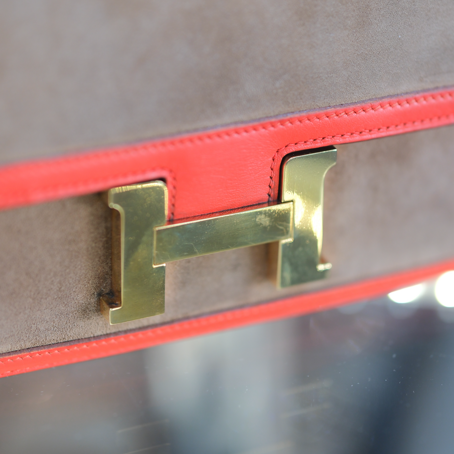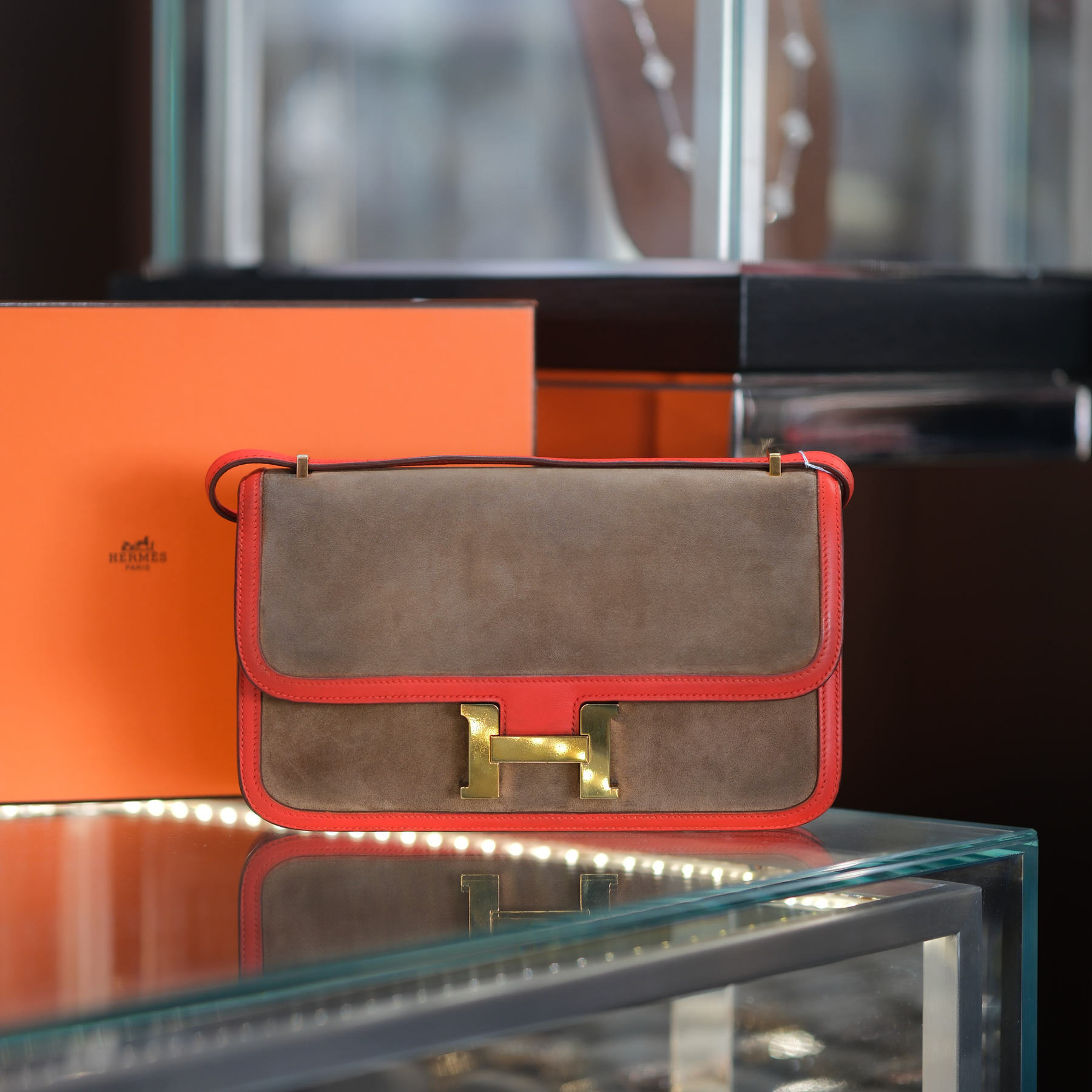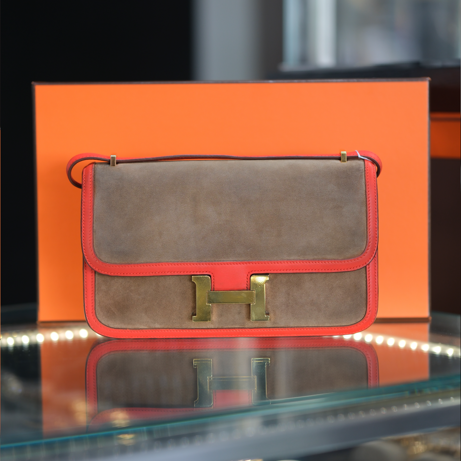 A timeless investment piece, the Constance Elan remains one of the most desirable silhouettes in the Hermès collection, especially in distinctive materials such as suede paired with gold hardware.