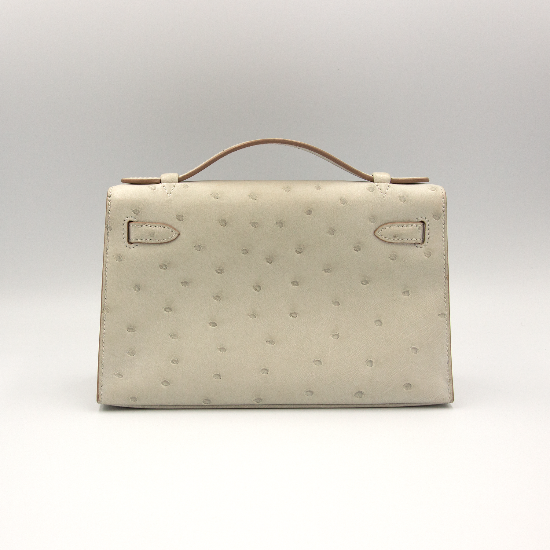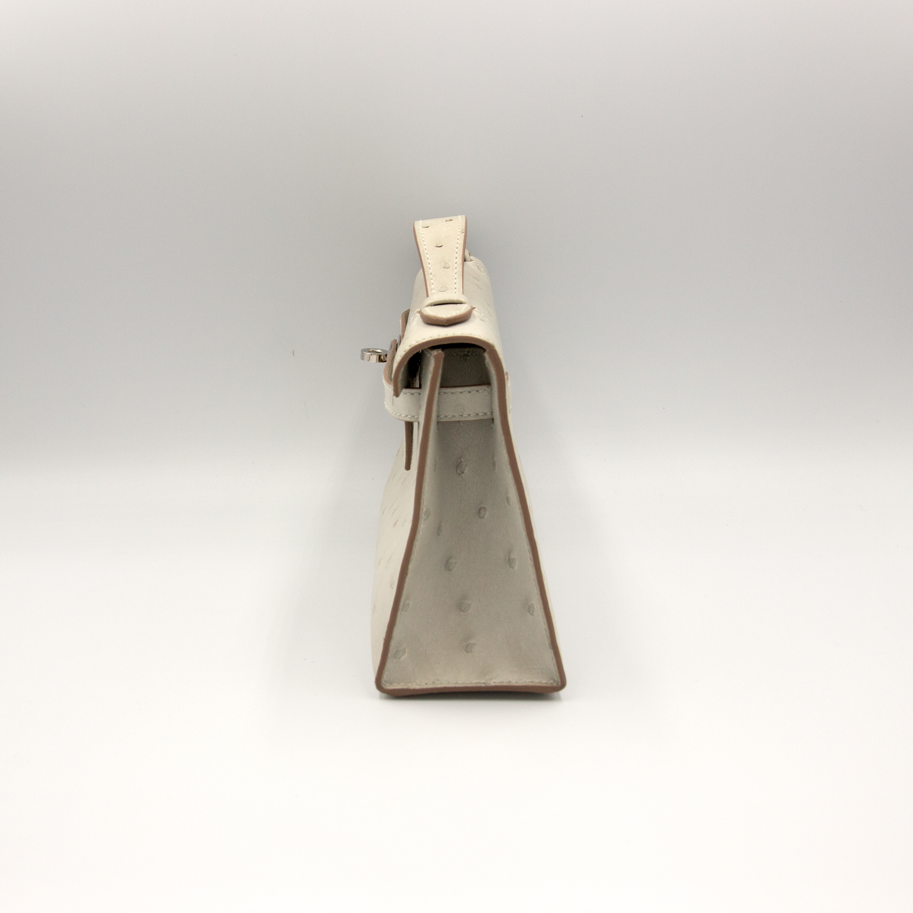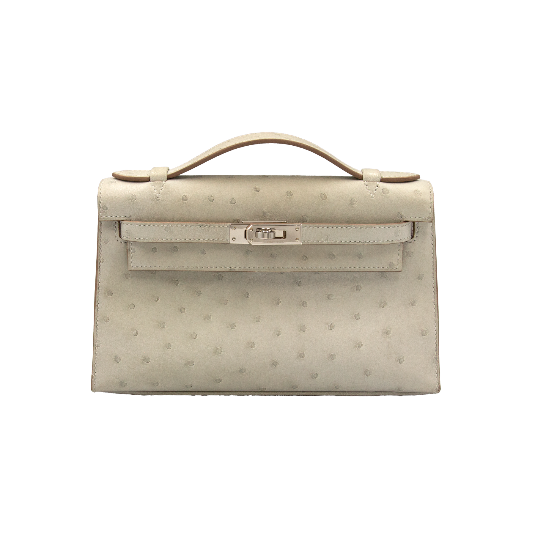 This Hermès Kelly Mini Pochette in Gris Perle ostrich leather with Palladium hardware is the embodiment of subtle luxury and timeless grace. The soft grey tone enhances the refined texture of the ostrich leather, while the compact silhouette brings versatility and sophistication.