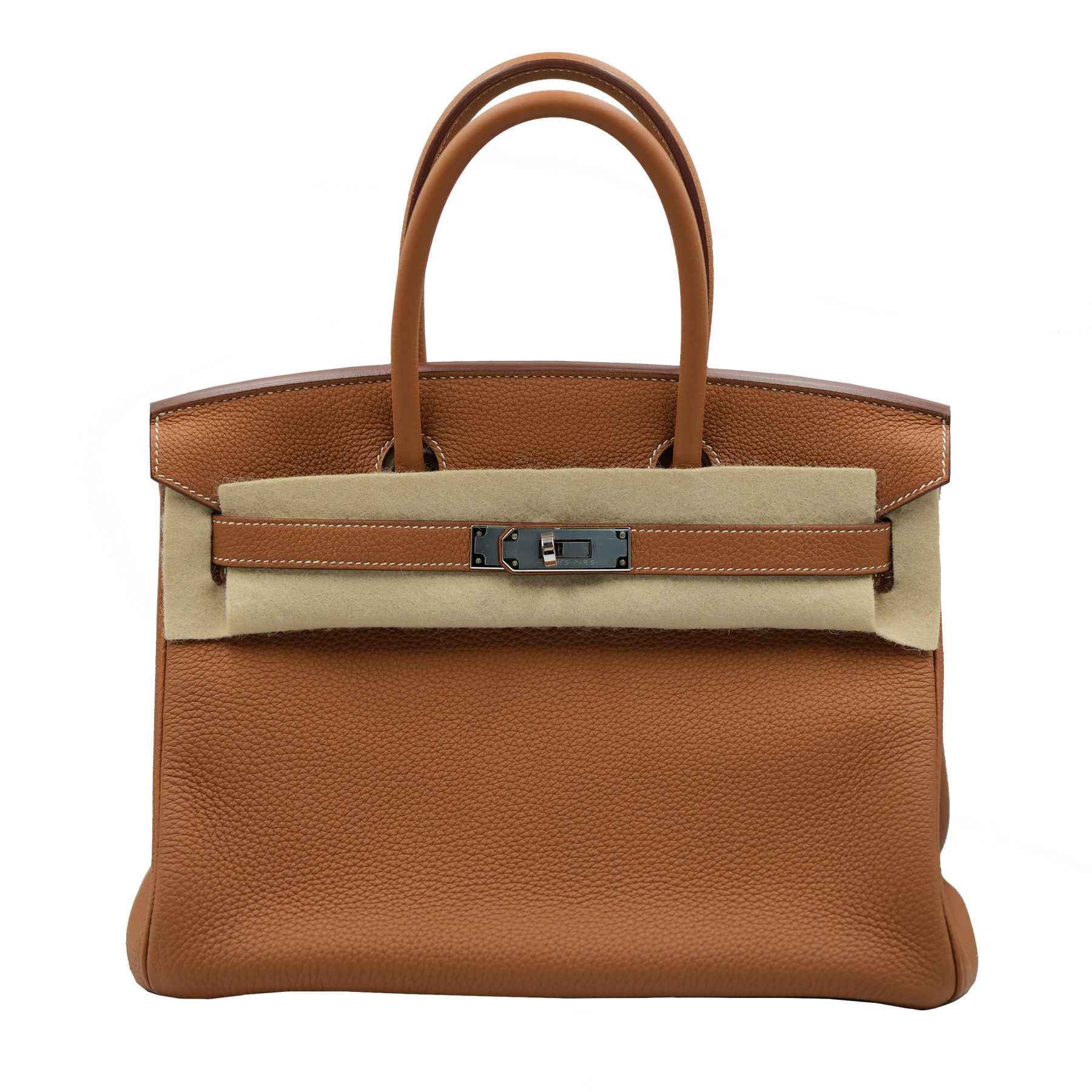 This Hermès Birkin 30 in Gold Togo leather with Palladium hardware is an iconic representation of timeless elegance. The bag features contrast stitching, a front flap, two straps with center toggle closure, clochette with lock and keys, and double rolled handles.