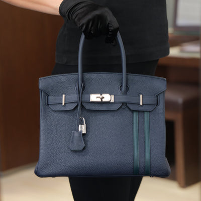 This Hermès Birkin 30 Officer in Bleu Nuit and Vert Cypress Togo leather with Palladium hardware is a rare and distinctive dual-tone masterpiece. The deep midnight blue exterior contrasts beautifully with the rich green interior, showcasing Hermès’ artistry in color harmony and material excellence.