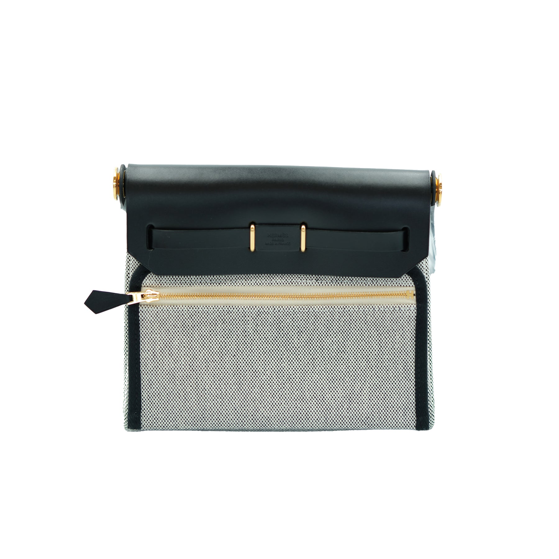 This Hermès Herbag Zip Mini 20 in Ecru-Noir canvas and Noir Cowhide leather with Gold hardware is a chic and casual interpretation of Hermès’ timeless craftsmanship. The combination of durable canvas and smooth leather gives this piece both structure and flexibility, while the gold accents elevate its refined aesthetic.