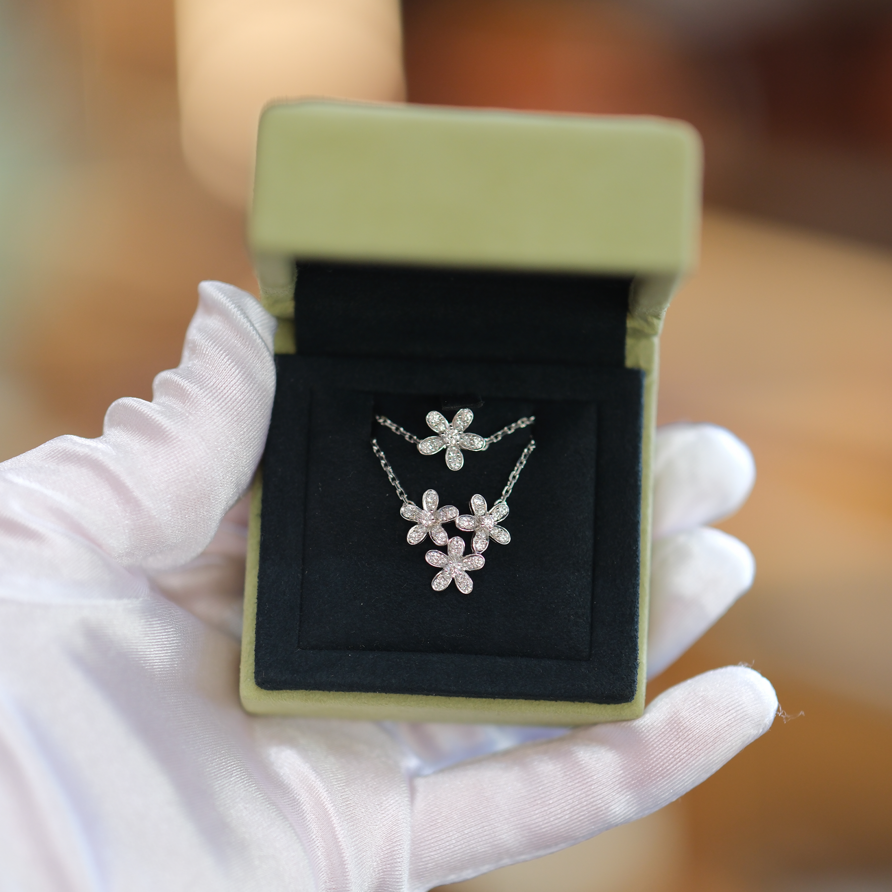 This Van Cleef & Arpels Socrate necklace is crafted in luminous 18k white gold and set with brilliant diamonds arranged in the Maison’s elegant floral Socrate motif. Inspired by nature and purity of form, the Socrate collection is celebrated for its refined symmetry and timeless femininity. The delicate diamond flower pendant is suspended from a fine white gold chain, offering a subtle yet sophisticated sparkle suitable for everyday elegance or special occasions. A graceful and understated piece that reflects Van Cleef & Arpels’ exceptional craftsmanship and design heritage.