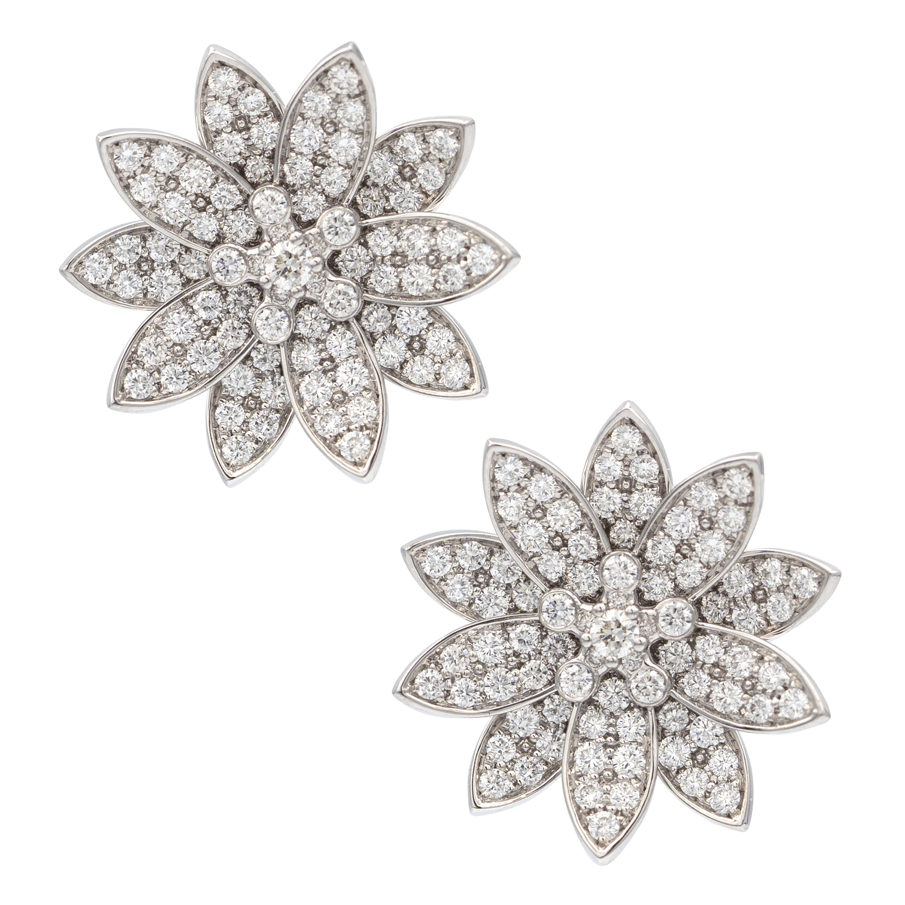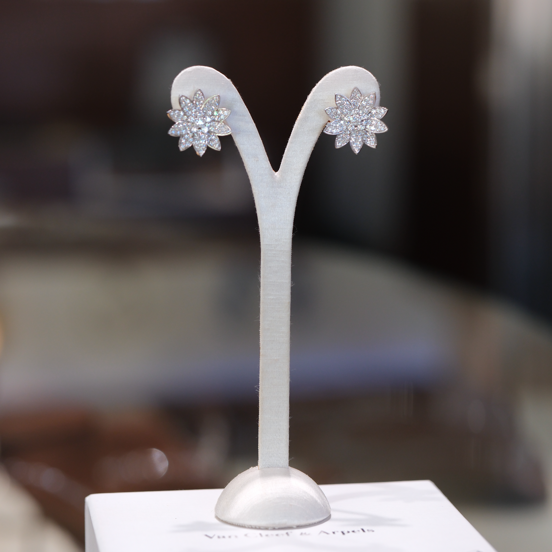 Van Cleef & Arpels Lotus Medium earrings crafted in 18K white gold and set with a total of 3.29 carats of brilliant-cut diamonds. Inspired by the delicate beauty of the lotus flower, these earrings feature an elegant floral composition that highlights exceptional diamond brilliance and refined craftsmanship. A statement piece that embodies Van Cleef & Arpels’ signature balance of femininity, sophistication, and timeless luxury. Diamond: 162 stones, 3.29 carats