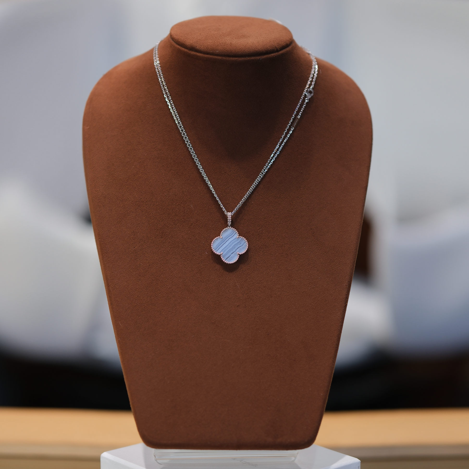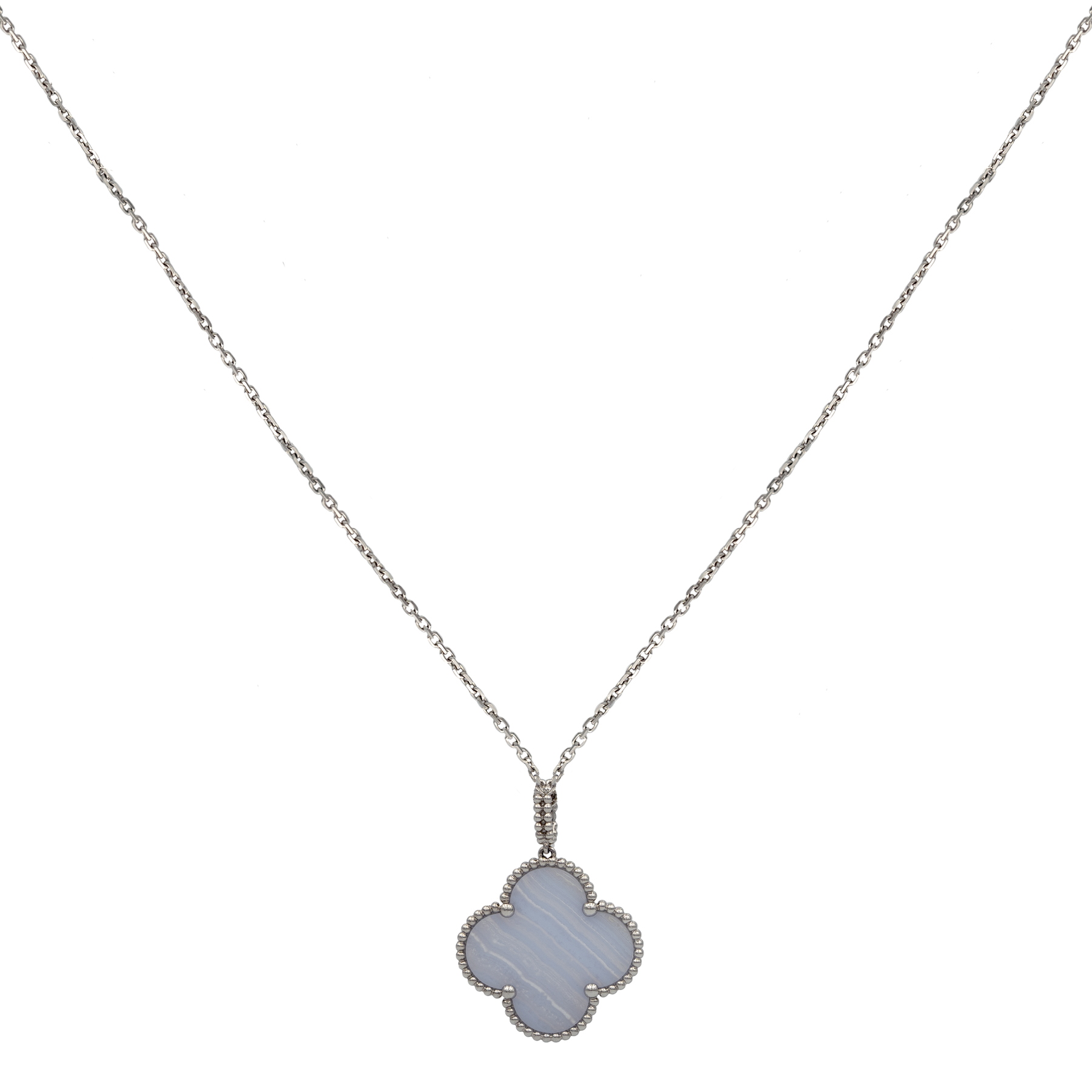 This Van Cleef & Arpels Magic Alhambra necklace is crafted in 18K white gold and features the Maison’s signature oversized quatrefoil motif set with luminous chalcedony. The Magic Alhambra collection is known for its bold proportions and refined elegance, offering a contemporary interpretation of the iconic Alhambra design. A striking yet timeless statement piece that reflects Van Cleef & Arpels’ exceptional craftsmanship and heritage.