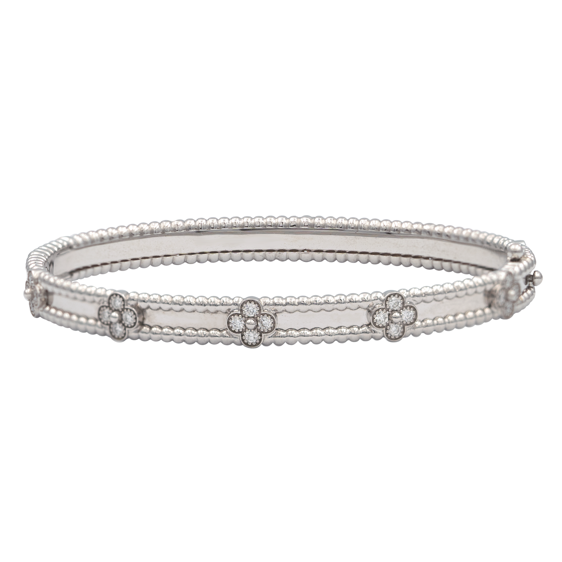 Van Cleef & Arpels Sweet Alhambra bracelet crafted in 18K white gold, featuring the iconic Alhambra clover motif set with diamonds. The elegant quatrefoil design is framed by the Maison’s signature beaded gold edge, symbolizing luck, harmony, and timeless refinement.