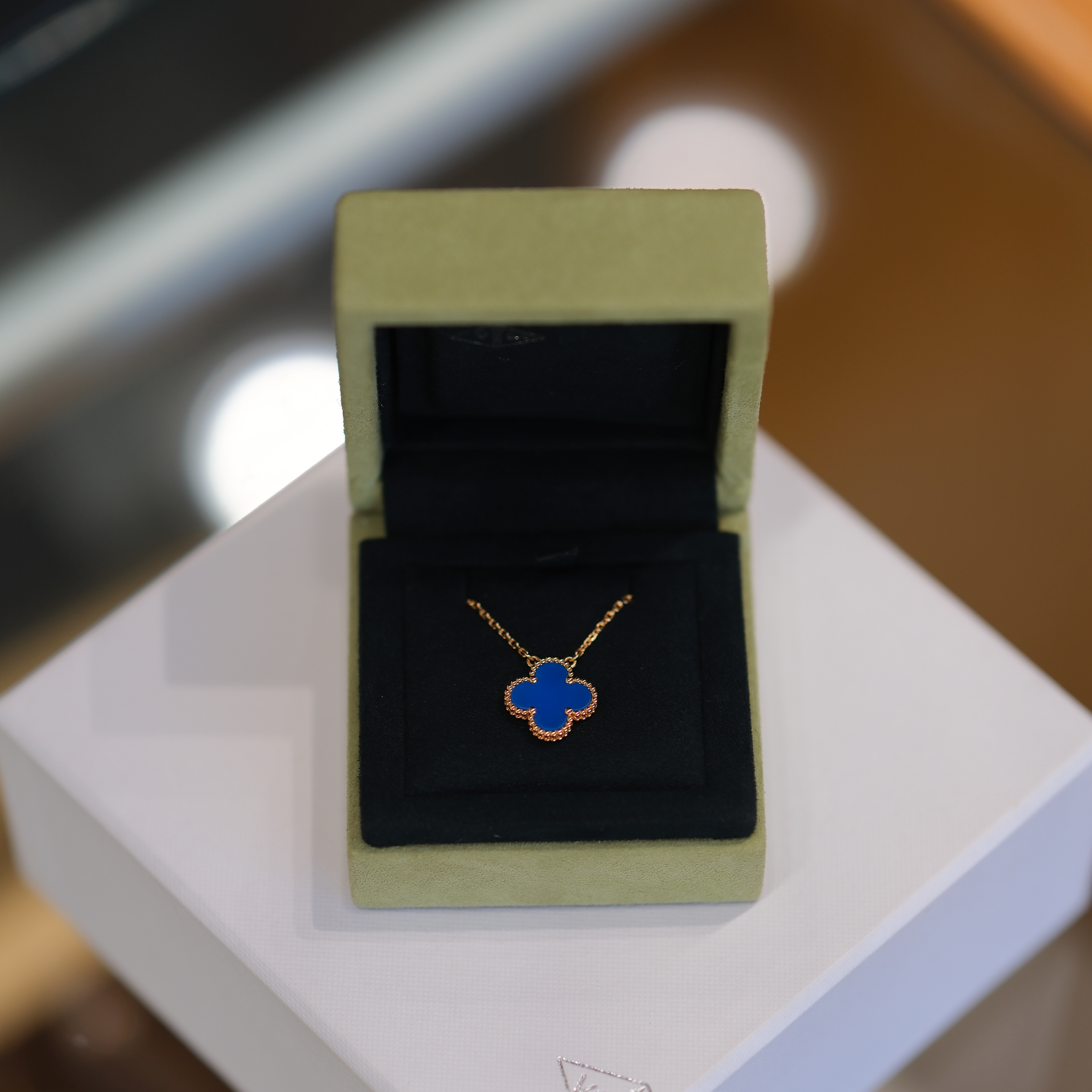 This Van Cleef & Arpels Vintage Alhambra necklace is crafted in 18K yellow gold and features the iconic quatrefoil motif set with rich blue agate. A timeless symbol of luck and elegance, the Vintage Alhambra design reflects the Maison’s heritage through clean lines, balanced proportions, and refined craftsmanship. A classic and versatile piece suitable for everyday wear or elegant layering.