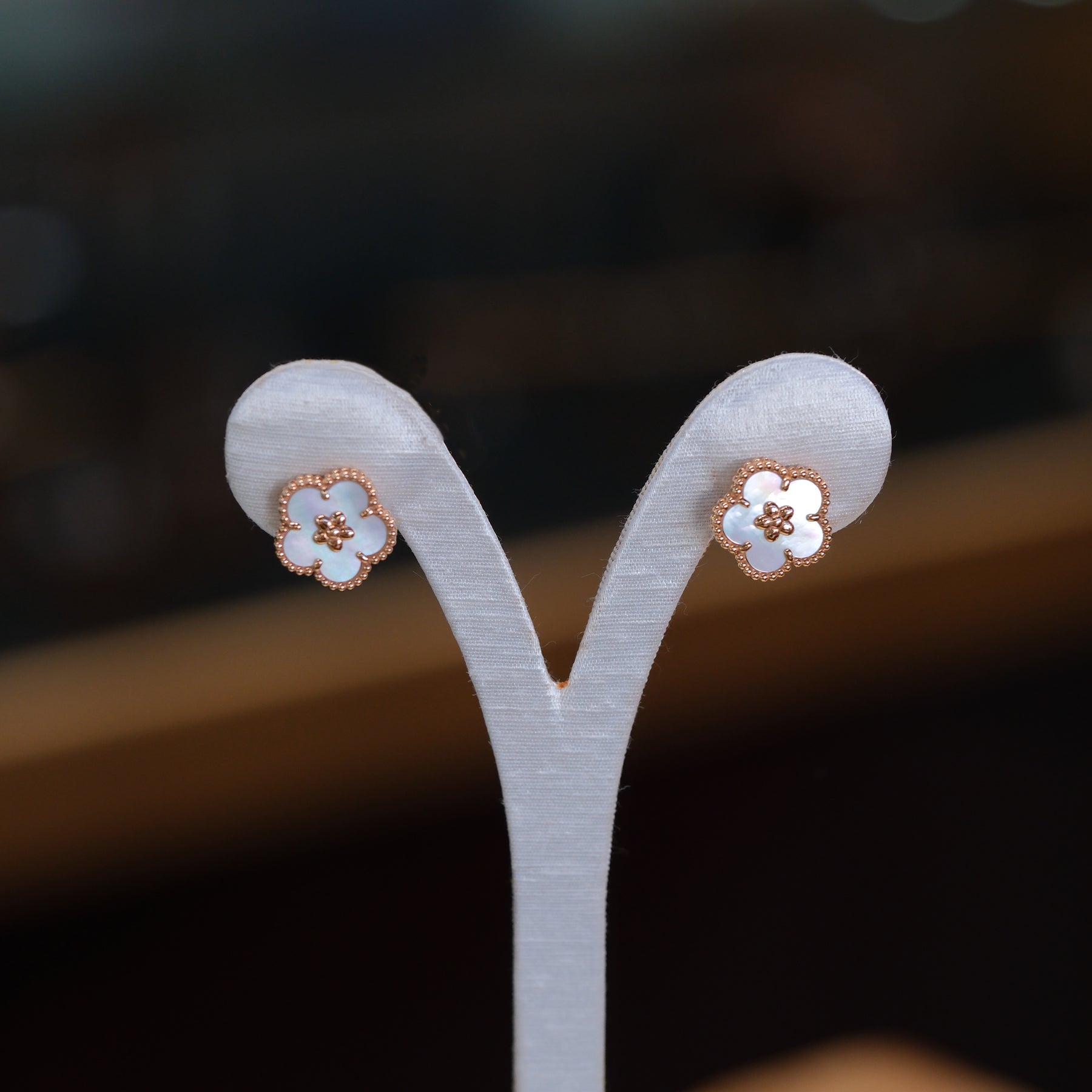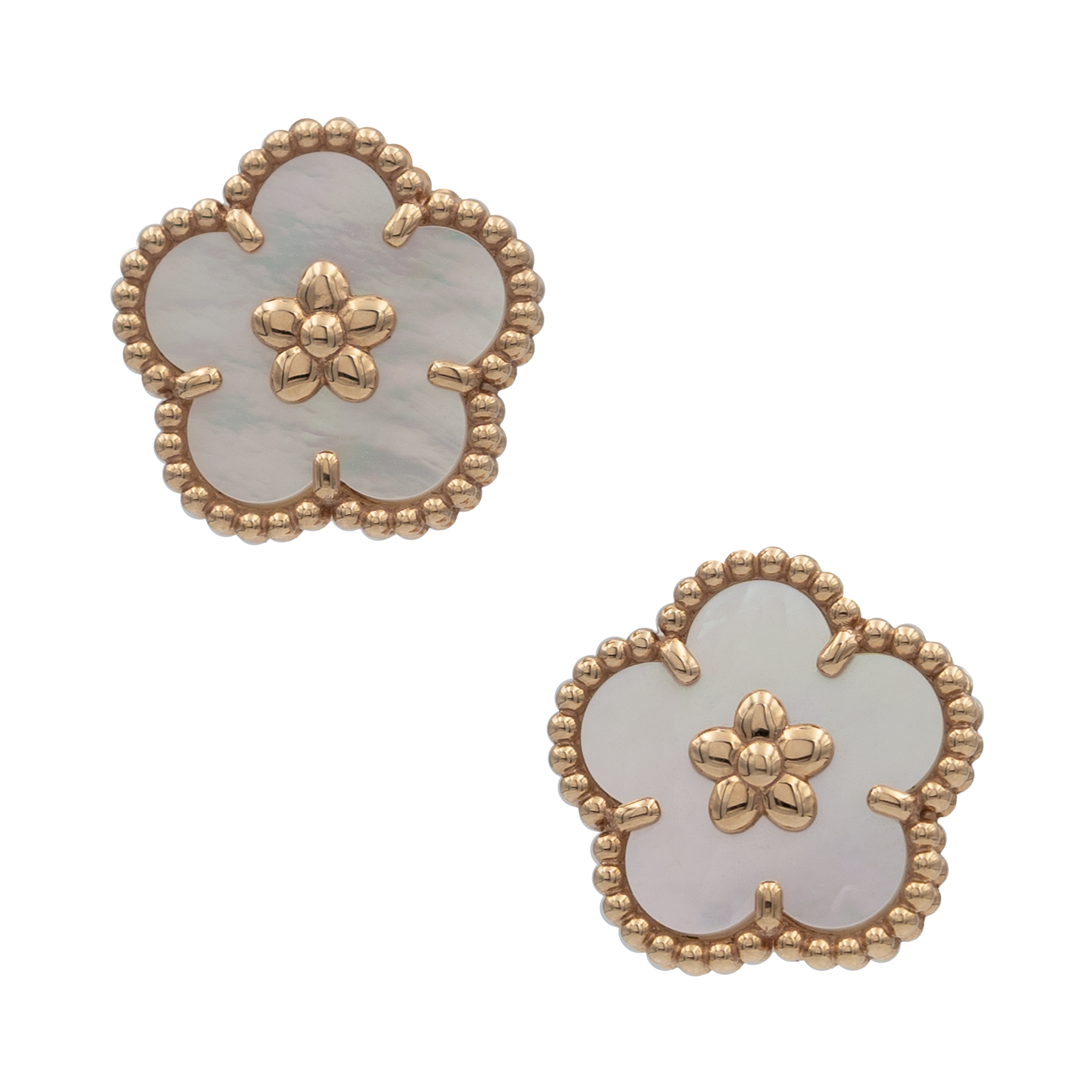 These Van Cleef & Arpels Lucky Spring Plum Blossom earrings are crafted in luminous 18k white gold and feature the Maison’s signature floral motif inspired by nature and renewal. Part of the Lucky Spring collection, the plum blossom symbolizes luck, prosperity, and new beginnings. The elegant silhouette and refined proportions make these earrings ideal for everyday wear while preserving the unmistakable sophistication and poetic design language of Van Cleef & Arpels. A timeless and feminine piece that embodies the harmony between fine craftsmanship and symbolic beauty.