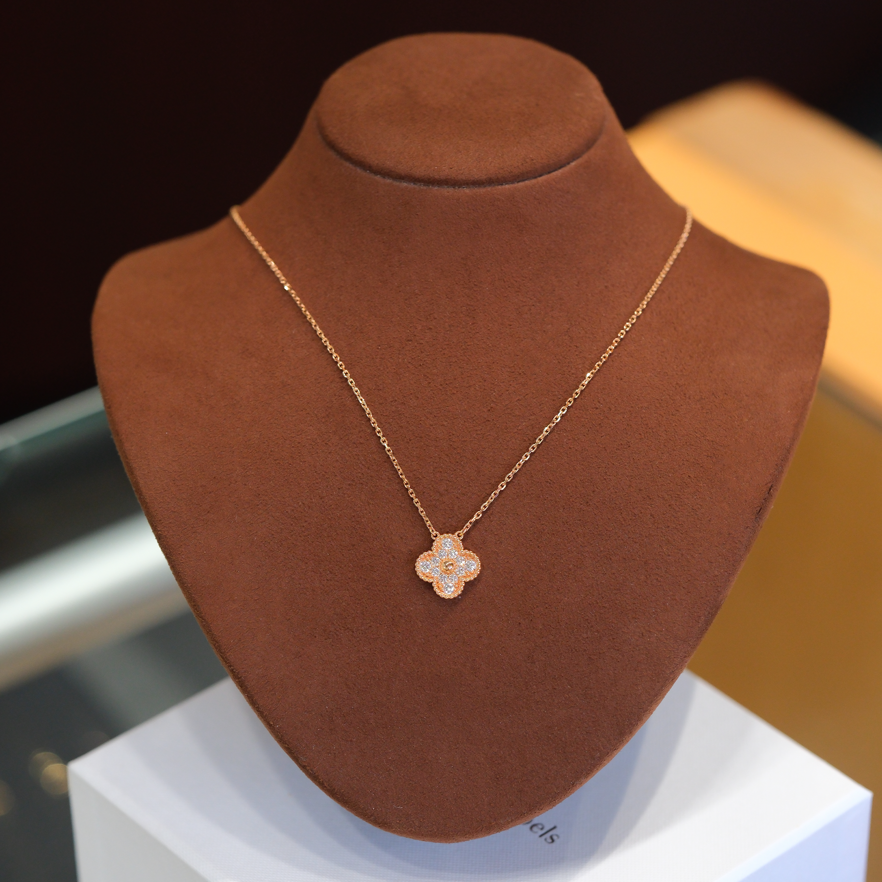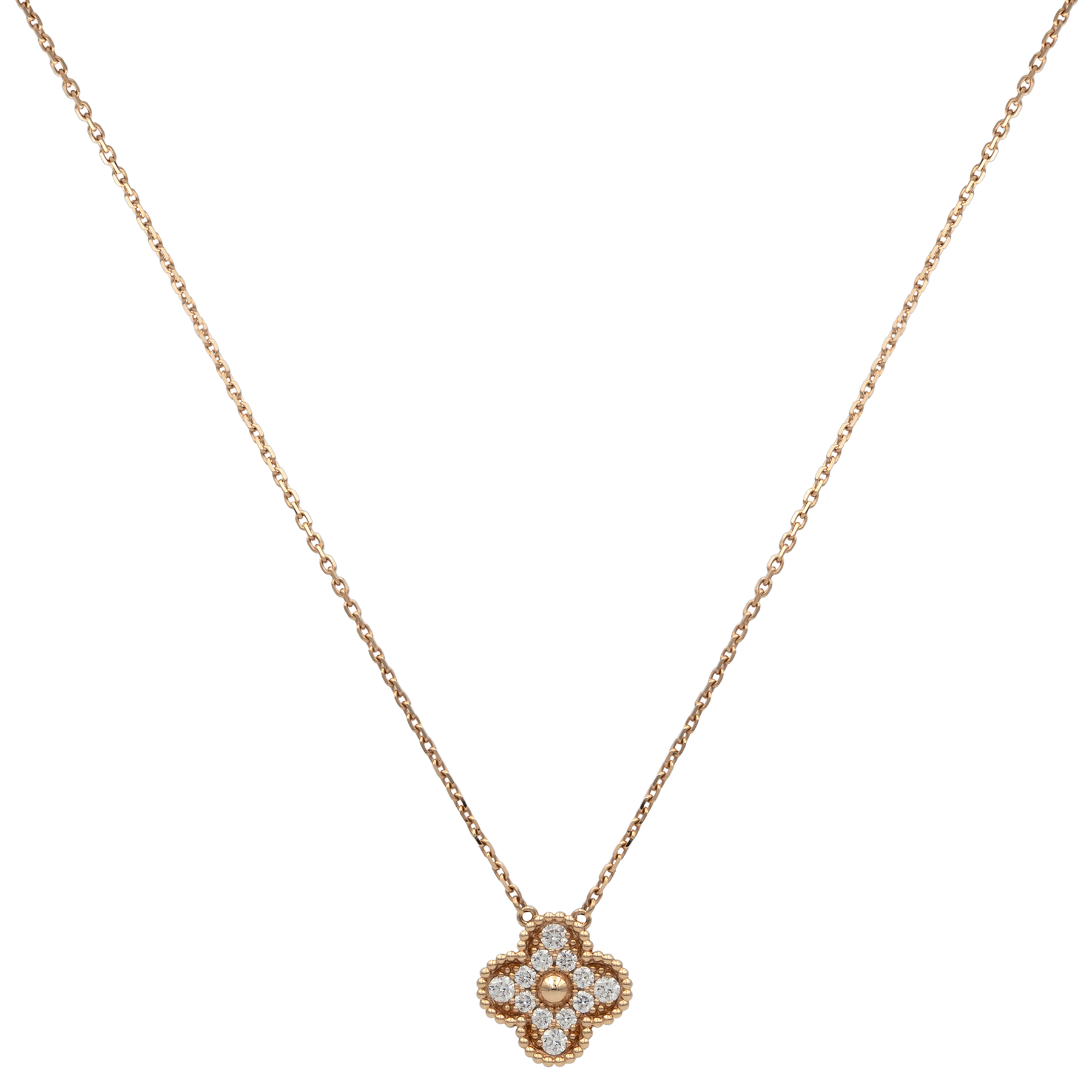 This Van Cleef & Arpels Vintage Alhambra necklace is crafted in warm 18k rose gold and set with brilliant diamonds, featuring the Maison’s iconic four-leaf clover motif. A symbol of luck, harmony, and elegance, the Vintage Alhambra design is one of Van Cleef & Arpels’ most recognizable and celebrated creations. The delicate rose gold chain perfectly complements the diamond-set pendant, creating a refined and timeless piece suitable for everyday wear or special occasions. A classic addition to any fine jewelry collection, combining symbolic beauty with exceptional craftsmanship.