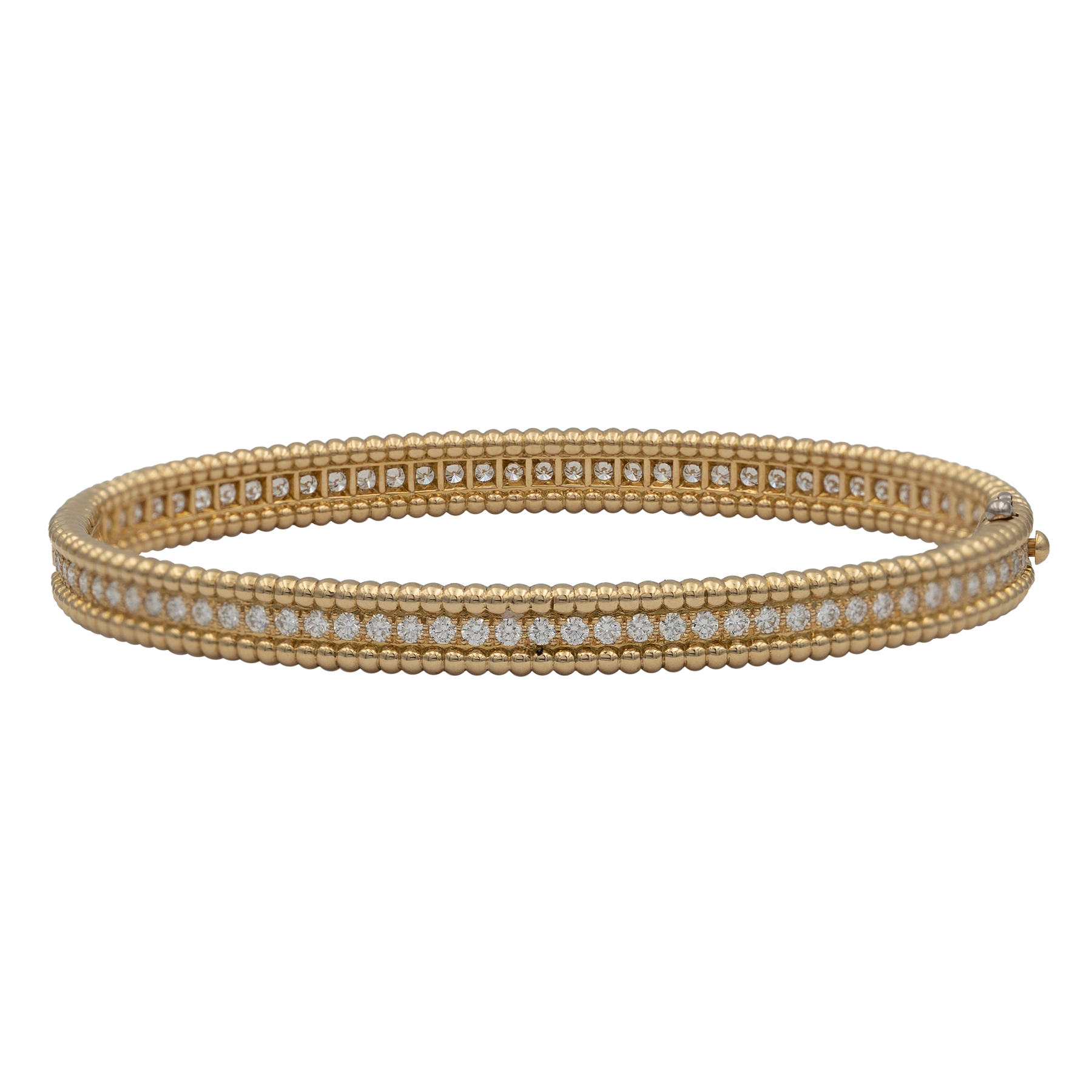 This Van Cleef & Arpels Perlee bracelet is crafted in radiant 18k yellow gold and accented with brilliant-cut diamonds totaling approximately 2.16 carats. Part of the iconic Perlee collection, the bracelet features the Maison’s signature beaded gold motif, creating a refined texture and elegant presence on the wrist. The diamonds are meticulously set to enhance brilliance while preserving the clean, timeless silhouette that defines Van Cleef & Arpels fine jewelry. A sophisticated statement piece designed for everyday luxury and enduring elegance.